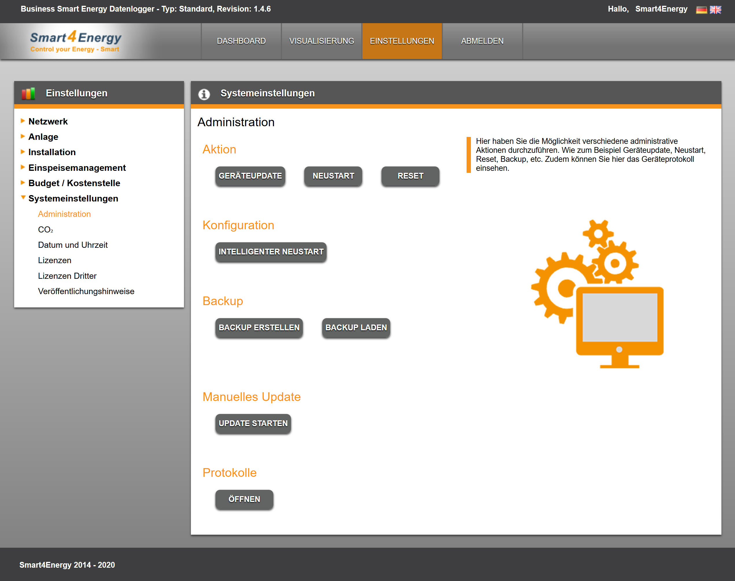 Mit dem Business Smart Energy Datenlogger nutzen Sie alle Eigenschaften des Monitors und überwachen zusätzlich lückenlos die Betriebs-, Erzeugungs- und Statusparameter, sowie die Fehlermeldungen Ihrer Photovoltaikanlage. Die Visualisierung erfolgt komfortabel über die Webanwendung EMS Standard ohne vorherige Softwareinstallation.